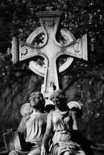 Through high-contrast monochrome, the photograph explores the humanity carved into the inorganic. The sharp interplay of light and shadow traces the emotional spectrum of stillness, allowing the marble to breathe and the silence to speak. It is a meditation on the "final reach," where the inorganic becomes a vessel for deep, enduring human emotion.